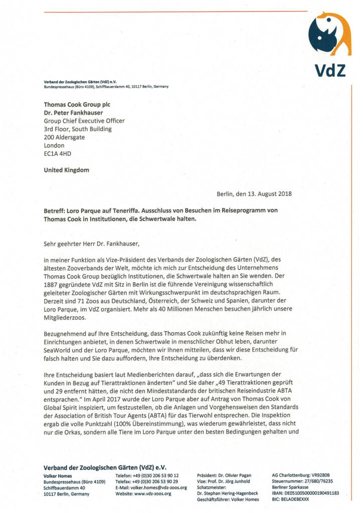 Offener Brief des Verbands der Zoologischen Gärten zu Thomas Cook