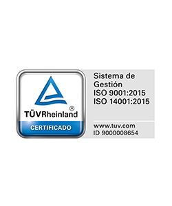 ISO 9001 – Certificado TUV Rheinland Sistema de gestión de calidad certificado respecto a la norma ISO 9001 desde 2013 ISO 14001 y Certificado TUV Rheinland por el alto respeto al Medio Ambiente desde 2005