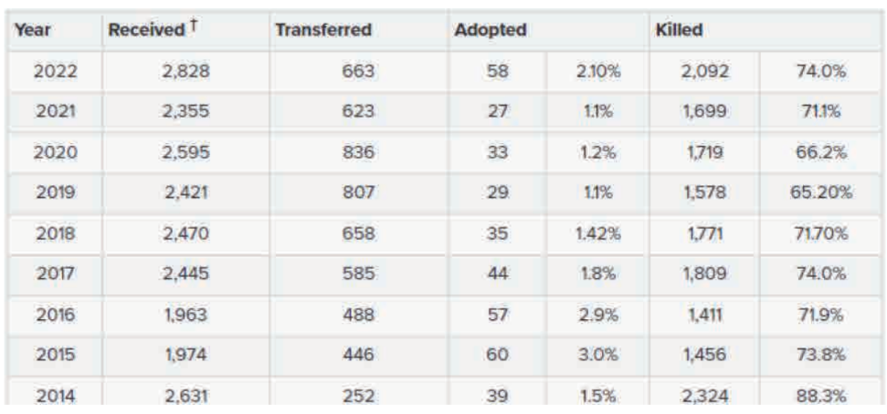 petakillsanimals.com. has compiled the data that PETA, obliged by state law, publishes regarding the number of pets they collect and how many of them are euthanised annually. The sample leaves no room for doubt: the vast majority of animals are dumped and euthanised.