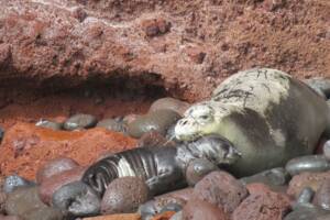 Madre y cría de foca monje en la entrada de una cueva en las Islas Desertas (Madeira). Foto: Instituto das Florestas e Conservação da Natureza da Madeira.